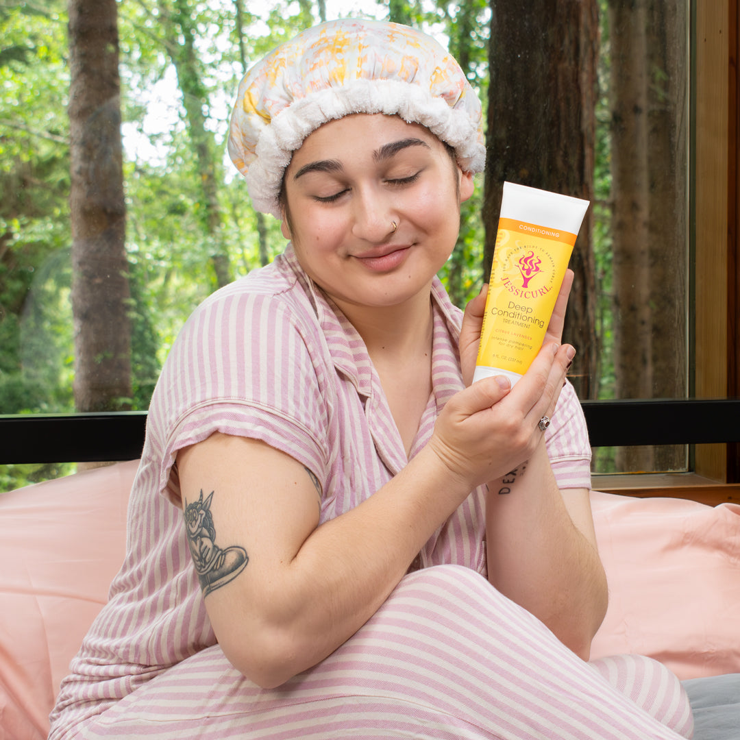 Deep Conditioning Treatment: Apply Jessicurl Deep Conditioning Treatment to clean, wet hair. You can add a few drops of our Oil Blend to the conditioner before applying it to your hair. Comb through with a wide tooth comb and let it settle in for 30-60 minutes. Apply heat from a heating source to your hair during the deep conditioning process. This can be done by using a microwaveable heating cap, warming the outside of your cap with a blow dryer, wearing a hooded or bonnet dryer or using a hair steamer. This heat generated from your scalp will allow the conditioner to better penetrate your hair. Rinse and style as usual.